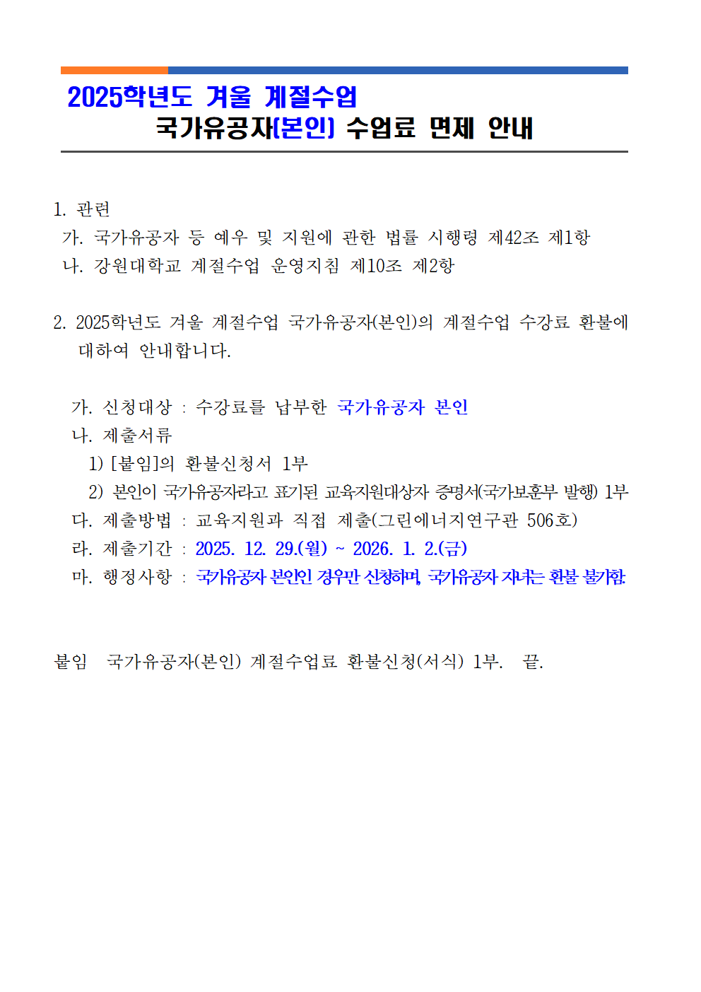 2025학년도 겨울 계절수업 국가유공자(본인) 수업료 면제 안내